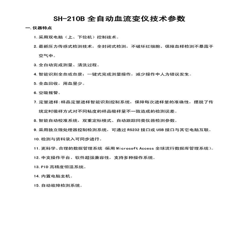 檢測19個參數:全血高、中、低切粘度、血漿粘度、全血還原粘度、全血高、中、低切流阻、全血卡森粘度、全血 卡森應力、全血高切相對粘度、全血低切相對粘度、紅細胞聚集指數、紅細胞聚集系數、紅細胞變型性、紅細胞剛性指數、紅細胞內粘度、血沉方程K值、血紅蛋白濃度。