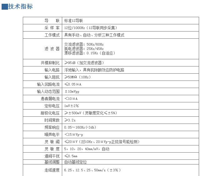 產(chǎn)品技術指標 1、彩屏7寸(800x480)液晶顯示屏 2、內(nèi)置可充電鋰電池,可待機10小時,持續(xù)打印3小時,連續(xù)打印300份心電圖。 3、自動模式下支持回放前10秒的心電圖,可快速打印、節(jié)約打印紙 4、支持全鍵盤中文拼音、五筆輸入病人和醫(yī)院信息 5、可直接通過USB、RS232進行文件另存、外接打印及上傳到ECGNET管理軟件上 6、適用小兒、急診、救護車等急救場合,無特殊使用環(huán)境限制 7、手動、自動、節(jié)律、存儲四種工作模式