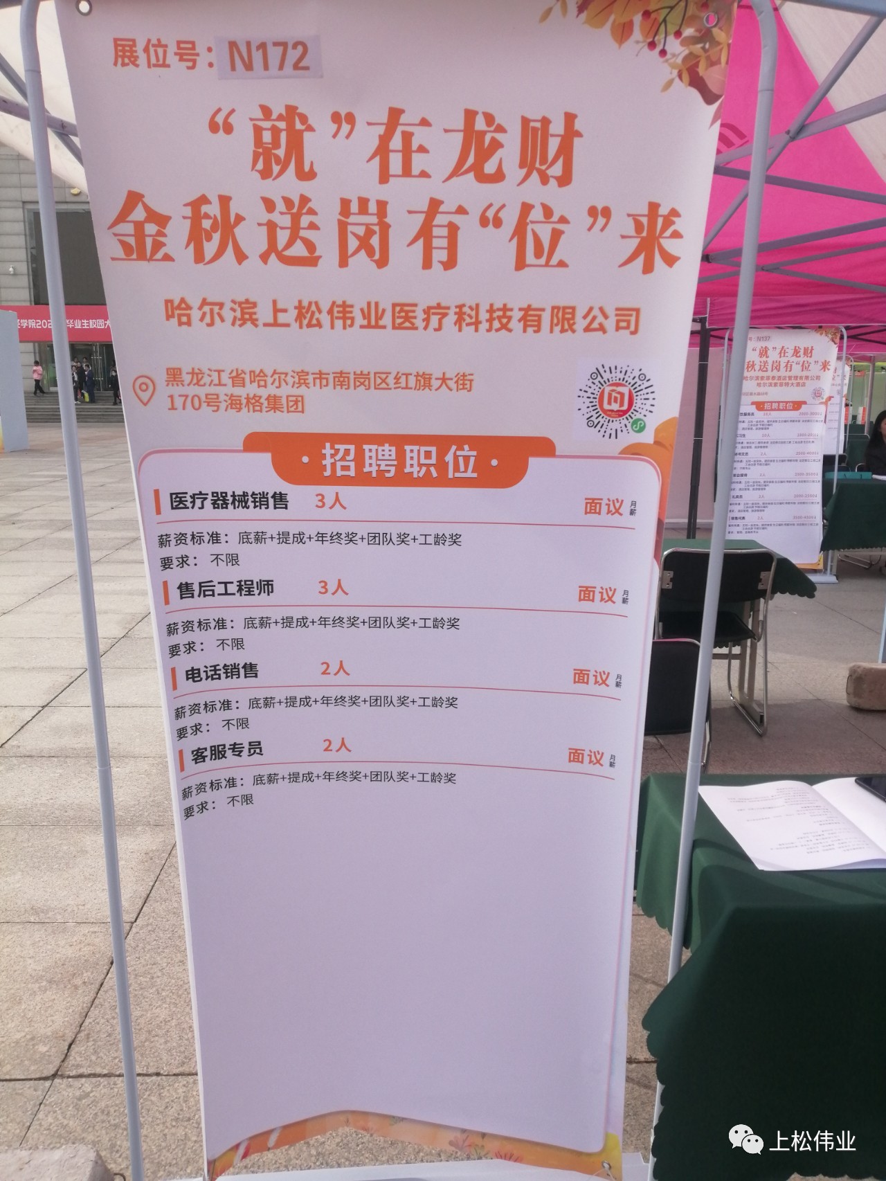 本次招聘會我公司主招銷售及售后人員,希望應(yīng)聘者能吃苦,有責(zé)任心,有較好的溝通工作能力和足夠的社會實踐。會上收到了學(xué)生投的簡歷,回到公司后會對學(xué)生簡歷情況進行認真考察。 上松偉業(yè)醫(yī)療重視人才、吸引人才、培養(yǎng)人才,歡迎廣大高校畢業(yè)生前來應(yīng)聘,上松偉業(yè)醫(yī)療期待您的加入。