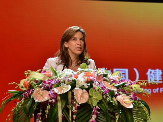 【張麗冰】現(xiàn)在進(jìn)行第八項(xiàng)議程:請(qǐng)來賓代表講話。先請(qǐng)瑞士健康局局長休.普特蘭茲(Sue Puttalaz)女士講話,大家歡迎?。?6:25)