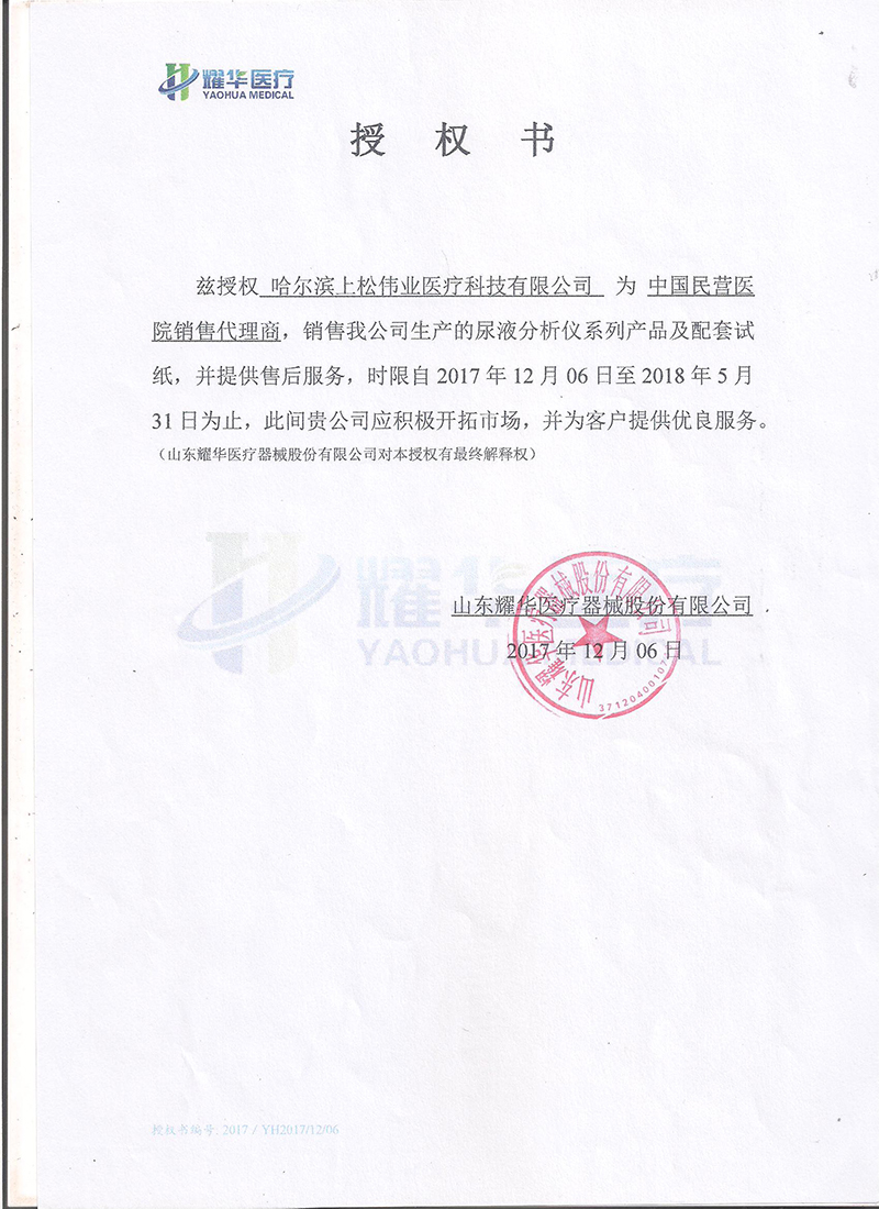 山東耀華授權(quán)書