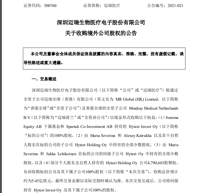 5月16日,邁瑞醫(yī)療發(fā)布公告稱:公司擬通過全資子公司邁瑞全球(香港)有限公司及香港全球的全資子公司Mindray Medical Netherlands B.V. 以現(xiàn)金形式收購Hytest Invest Oy(下文簡稱“海肽生物”)及其下屬子公司100%股權(quán)。