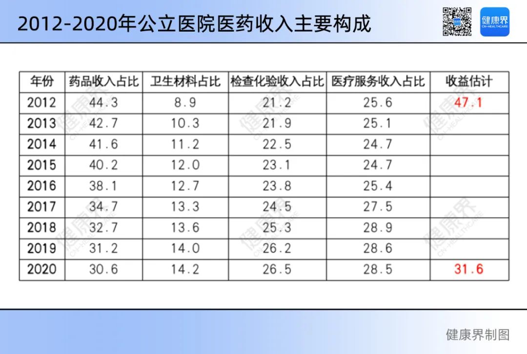 這一說法是有一定數(shù)據(jù)支撐的。國家衛(wèi)健委一位衛(wèi)生政策研究者在2022健康界云峰會上介紹,2012年,公立醫(yī)院藥品收入占總收入的44.3%,醫(yī)療服務(wù)性收入占比25.6%。