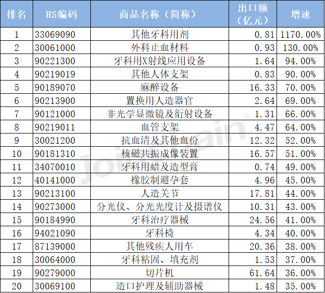 03、出口額增速排名:牙科類商品出口增速最快